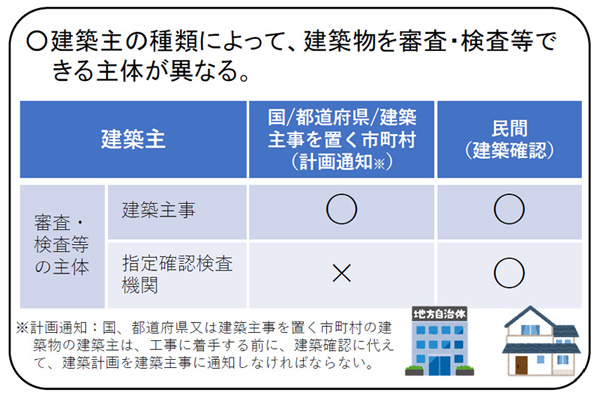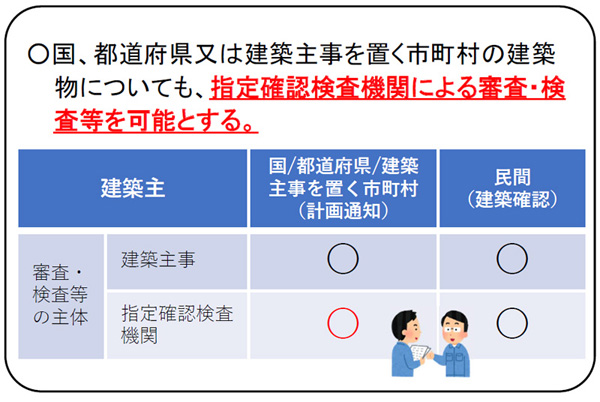 令和6年6月に公布された、建築基準法の改正において、国、都道府県又は建築主事を置く市町村が建築等をしようとする建築物(「計画通知」)について、その計画が建築 基準関係規定に適合するかどうかの審査及び当該工事を完了した場合における検査等を指定確認検査機関が行うことが可能となります。